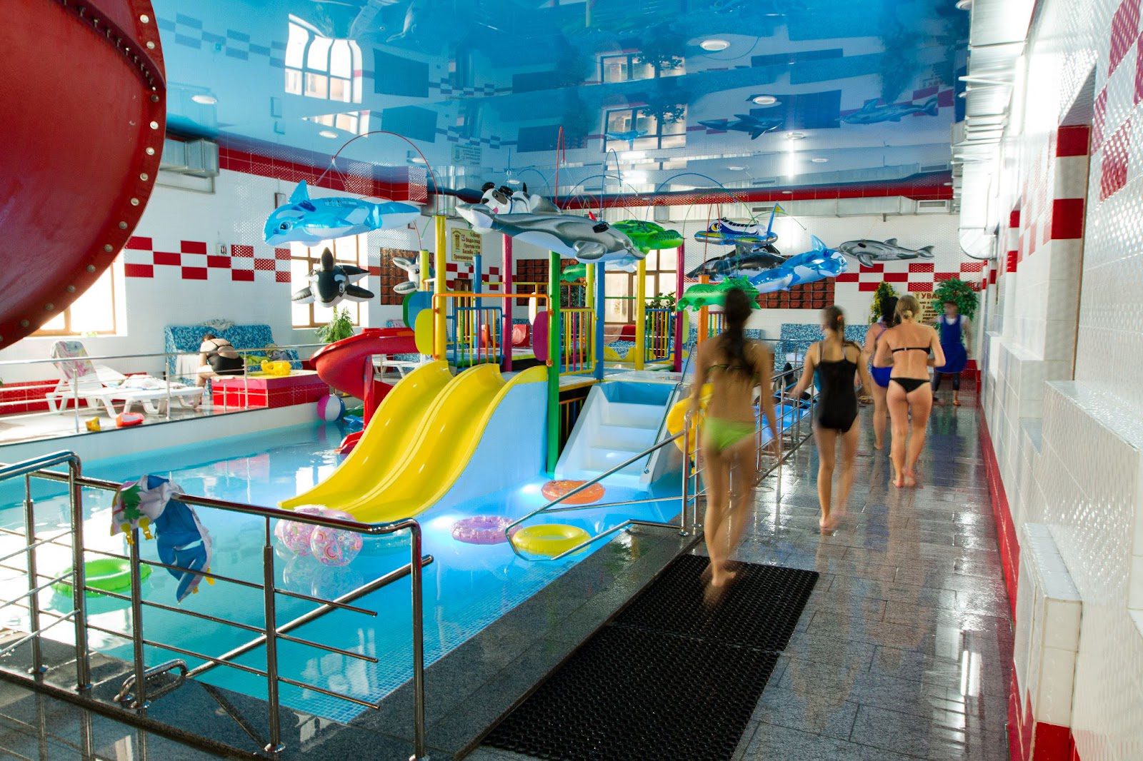 В детском бассейне проводят групповые занятия по плаванию, вода здесь намного теплее (около 32°С).